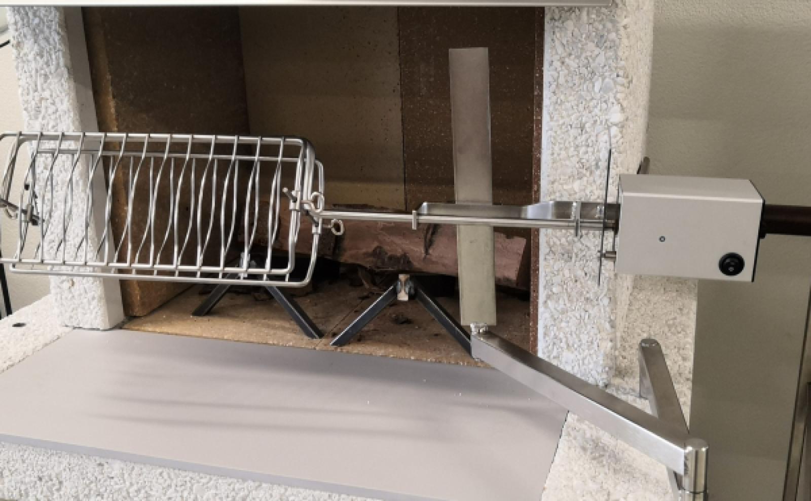 Hochwertiger Edelstahl-Bratkorb für gleichmässiges Garen über dem Feuer. Inklusive Halterung und Akkumotor – ideal für Rollbraten, Gemüse oder Geflügelteile.