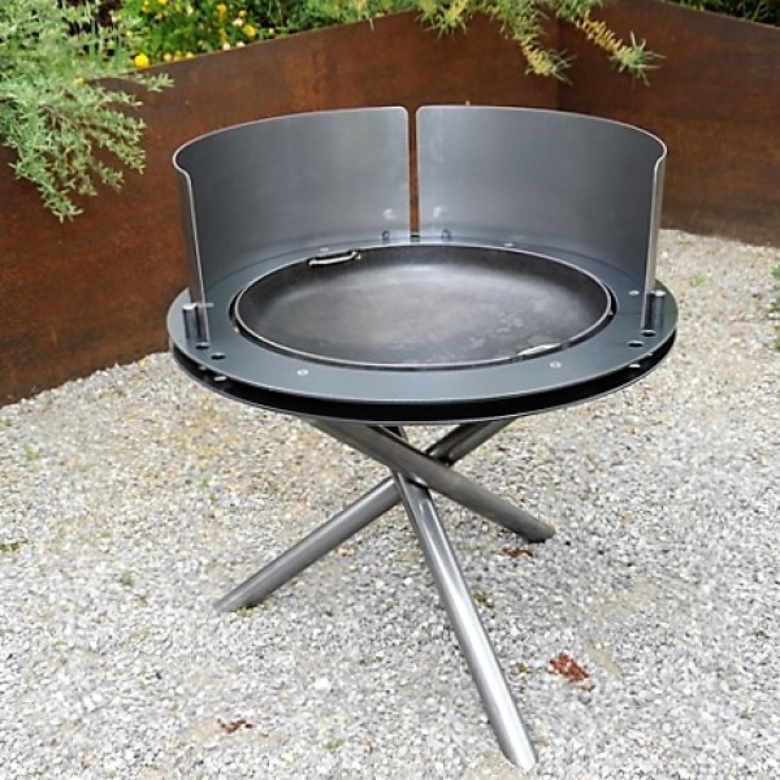 Die elegante Unterkonstruktion aus drei gekreuzten Rundrohren verleiht der Feuerschale nicht nur ihre charakteristische Optik, sondern sorgt auch für Stabilität und eine angenehme Arbeitshöhe beim Grillieren. Die doppelte Umrandung dient als Aufnahme für vielseitiges Zubehör wie Doppelarm, Windschutzbleche oder eine Holzablage – ganz nach Ihrem Bedarf.