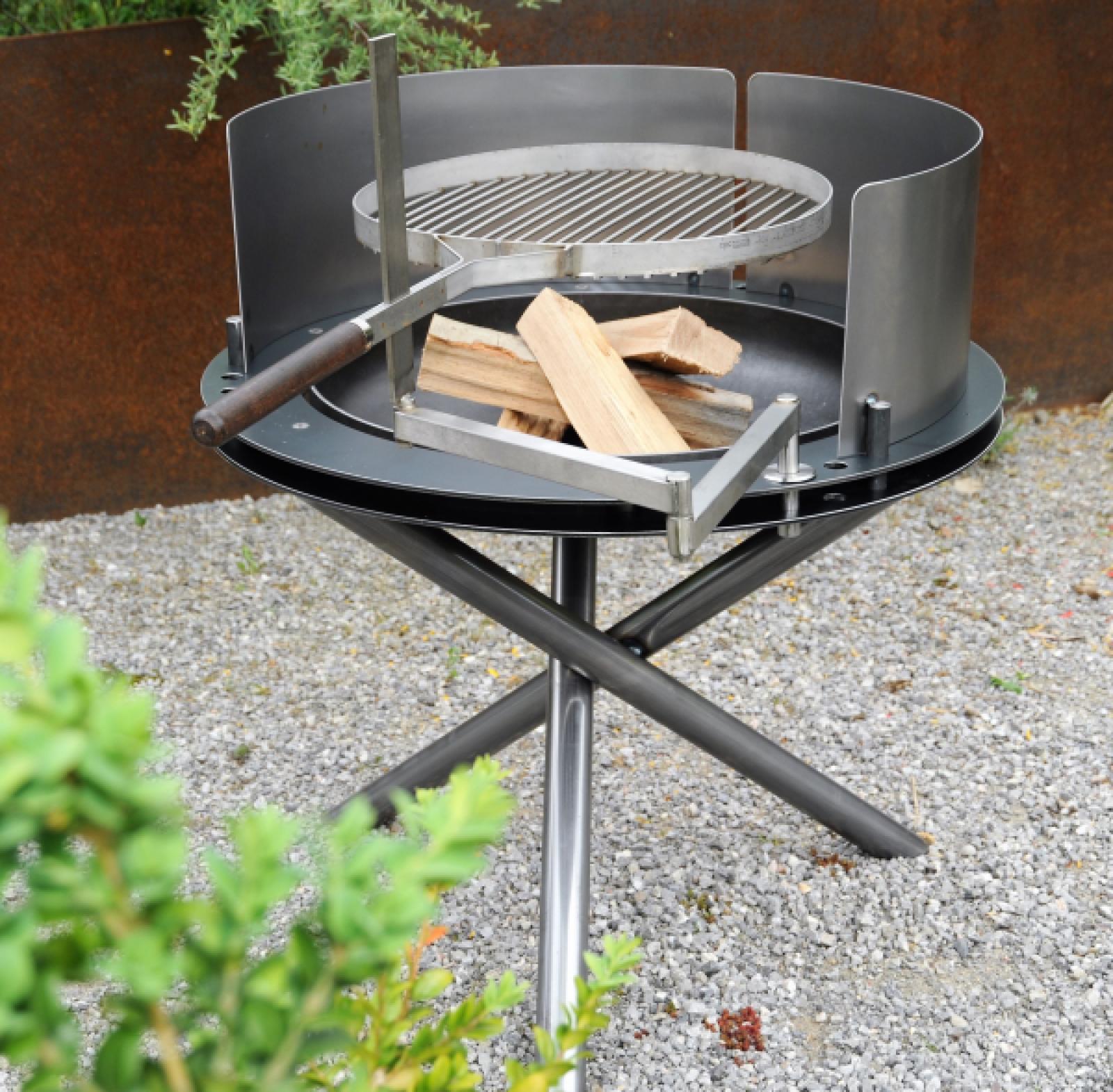 Erhältlich in rohem Stahl mit lebendiger Rostoptik oder in hochwertigem Edelstahl für eine besonders langlebige Ausführung. In Kombination mit einem Grillrost Ø 60 cm und Schwenkarm wird «Tre» zur stilvollen Grillstation.