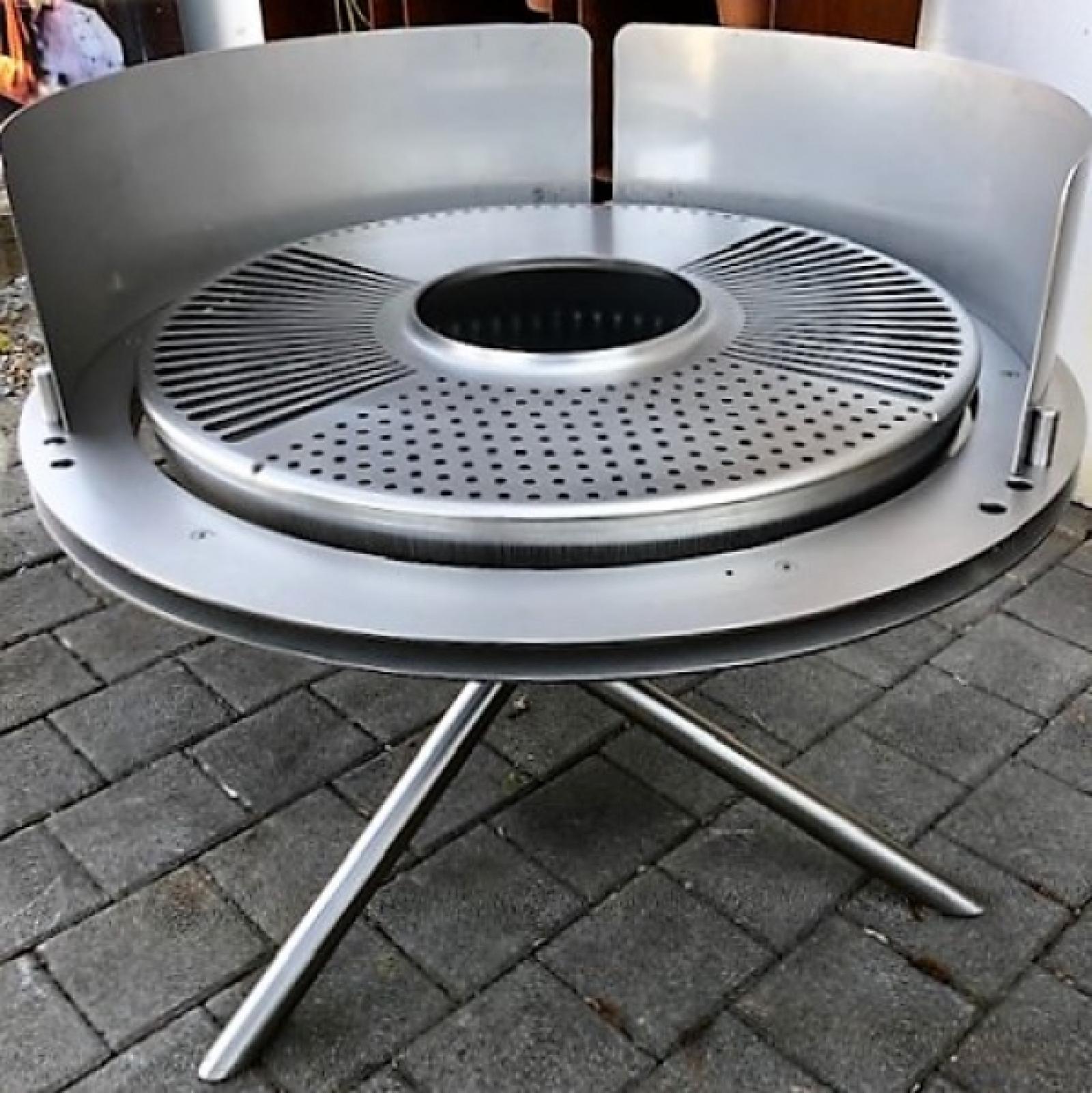 Die elegante Unterkonstruktion aus drei gekreuzten Rundrohren verleiht der Feuerschale Leichtigkeit und Standfestigkeit zugleich – auf einer angenehmen Höhe für bequemes Arbeiten am Feuer. Die doppelte Umrandung ist wie gewohnt vorbereitet für Zubehör wie Doppelarm, Windschutzbleche oder Holzablage.