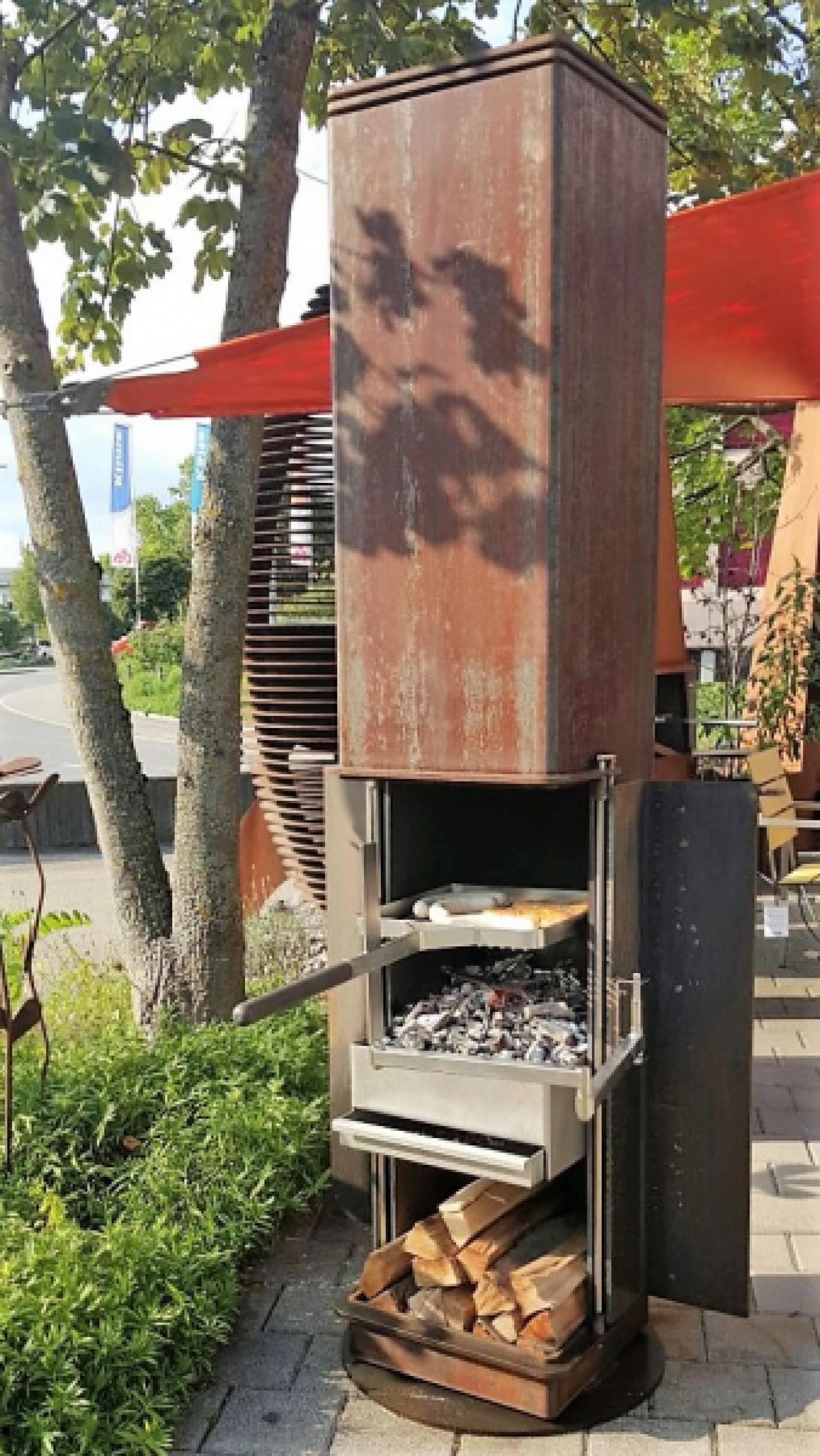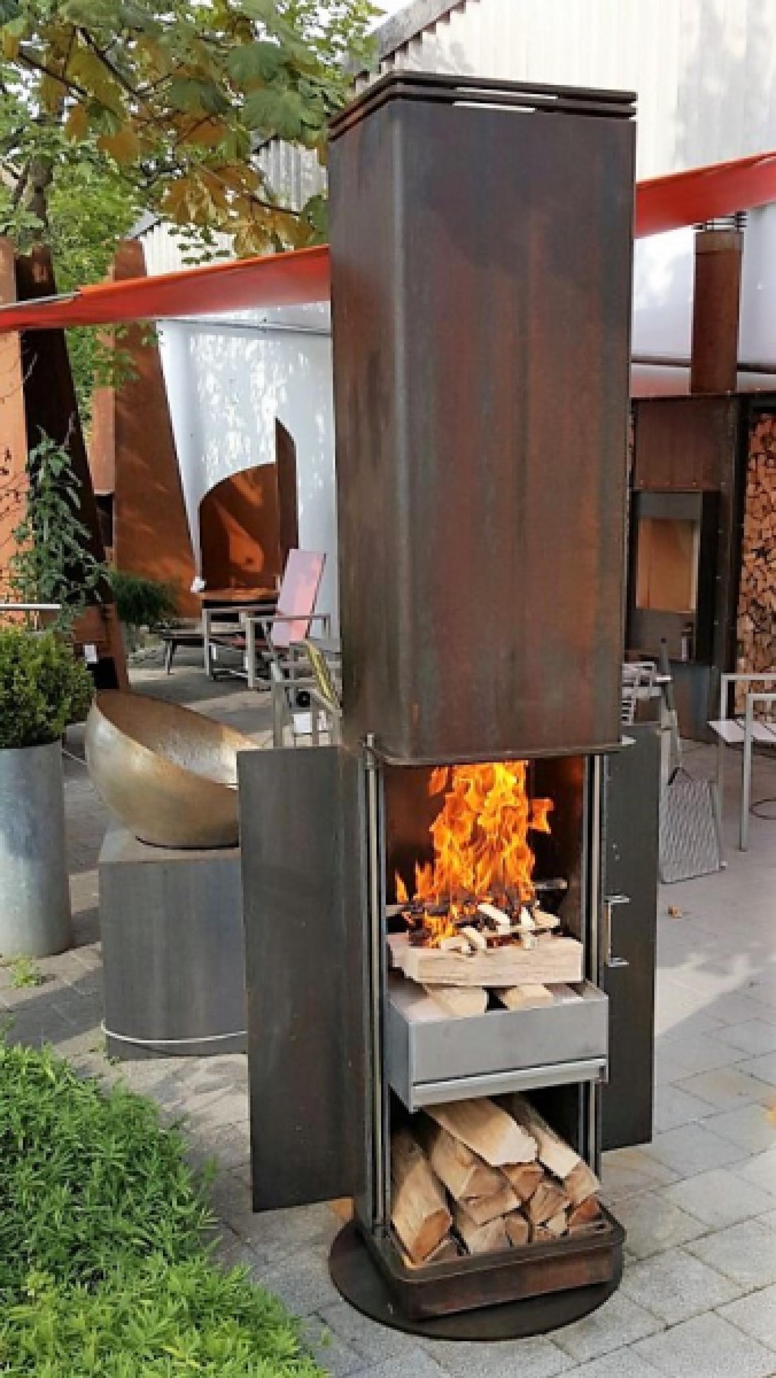 Ob mit offenen Flammen oder geschlossenen Türen: Die massive Konstruktion aus bis zu 10 mm starkem Stahl strahlt Beständigkeit und Ruhe aus. Die natürliche Patina verleiht «Faro» eine unverwechselbare Oberfläche, die sich mit der Zeit weiterentwickelt – für ein lebendiges, einzigartiges Erscheinungsbild im Aussenraum.