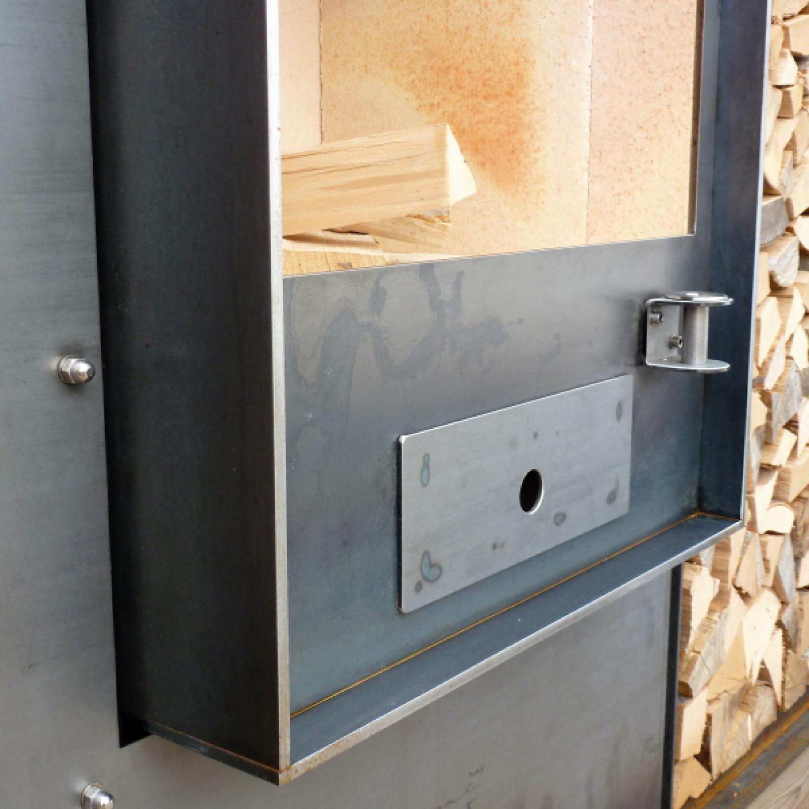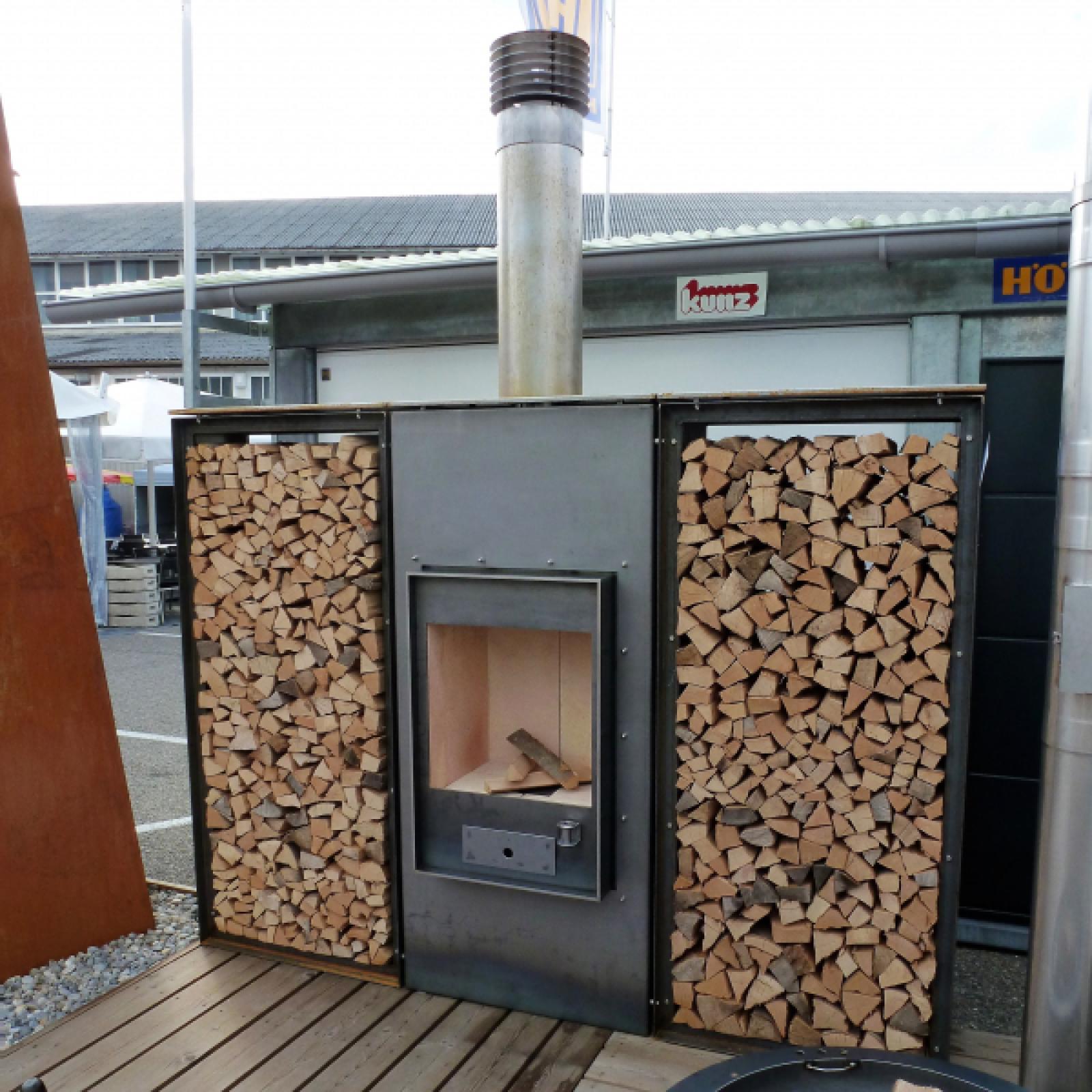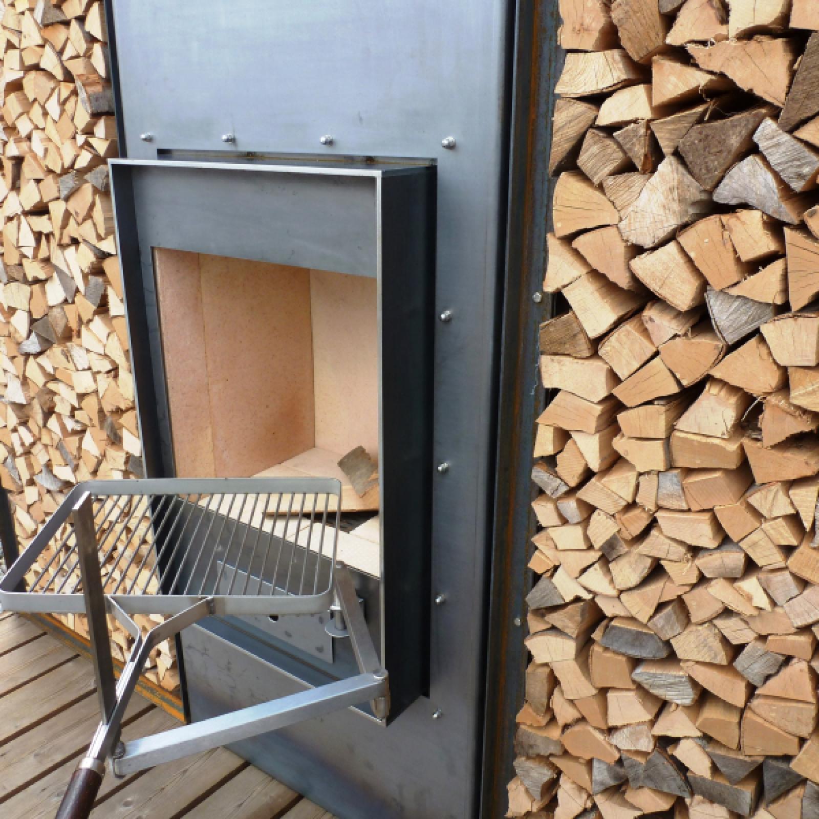 Der komplett schamottierte Feuerraum sorgt für optimale Hitzespeicherung, während eine praktische Ascheschublade die Reinigung erleichtert. Der Rauchabzug erfolgt über einen isolierten Edelstahlkamin, der je nach Bedarf flexibel verlängert werden kann. In Kombination mit optionalen Holzspeichern entsteht nicht nur zusätzlicher Stauraum, sondern auch ein wirkungsvoller Sicht- und Windschutz – ideal für windige Standorte oder als architektonisches Element im Garten.