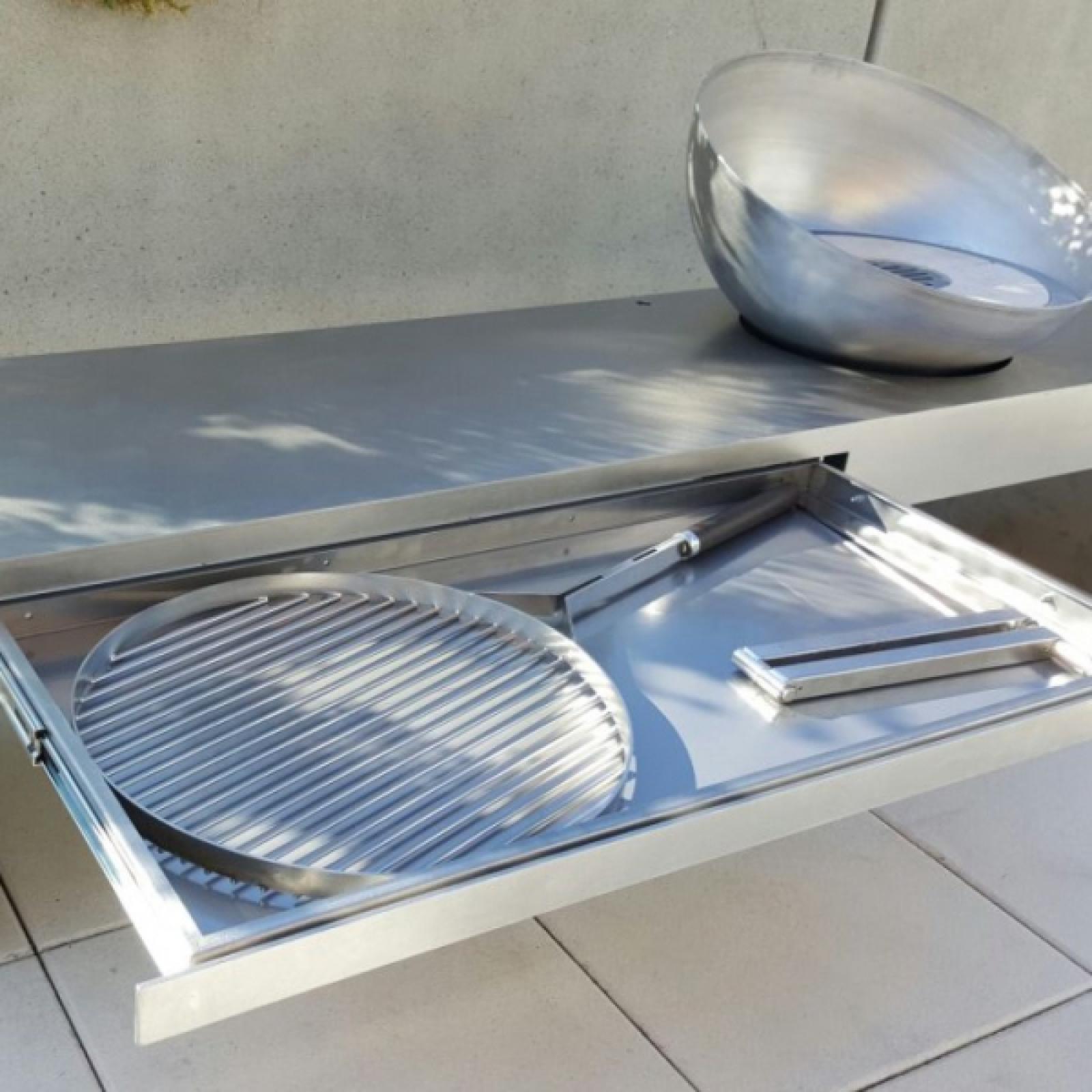 Der schlanke Korpus ist nicht nur ästhetisch, sondern auch praktisch: Eine grifflose Schublade bietet Platz für Grillzubehör wie Rost und Doppelarm. Die um 360° drehbare Feuerschale sorgt für maximale Flexibilität – ideal für den Einsatz als Grillstation oder stimmungsvolle Feuerquelle auf der Terrasse.